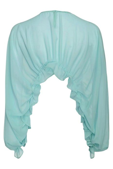 Cropped Shrug Top In Light Chiffon. Round Neck, Long Sleeves And Frills With Elastic Along The Bottom. Small Button-Adorned Central Keyhole Fastening At The Back. - Model Is 176Cm Tall And Wears A Size 40.