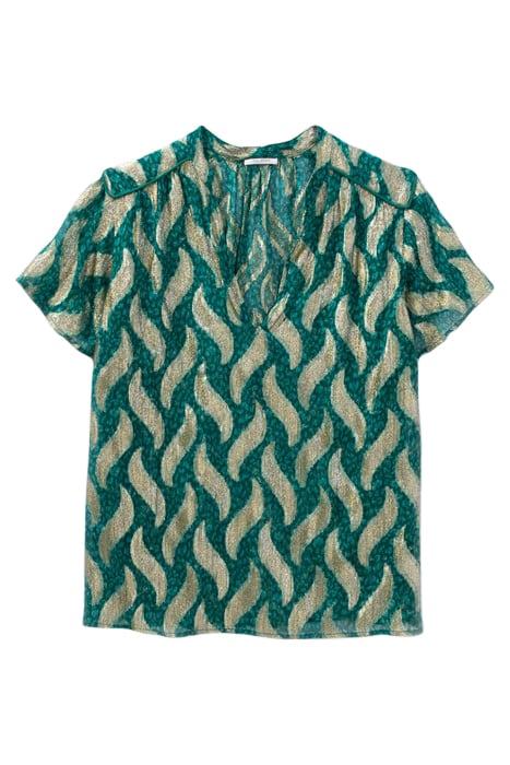 The Gold Leaf Print On An Emerald Green Background Wows On This Flowy, Glinting Top In Viscose Jacquard Voile With Metallic Threads.