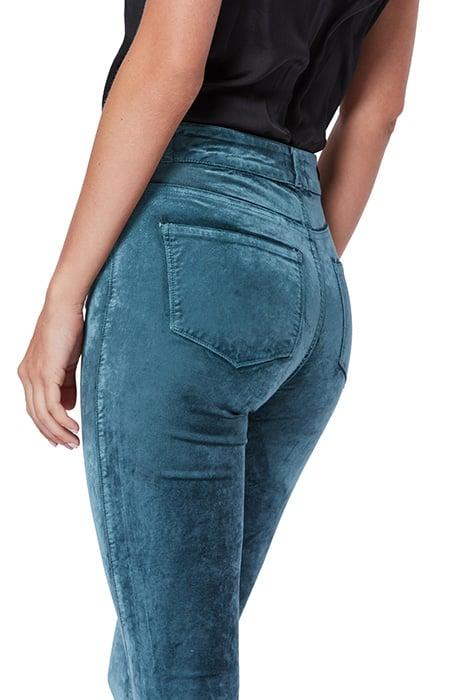 Our moody sea-blue stretch velvet fabric turns retro-inspired with an exposed button front and ultra high rise ankle silhouette. Tuck it into a T-shirt for a laid-back look or style with a silk cami for a more refined vibe.