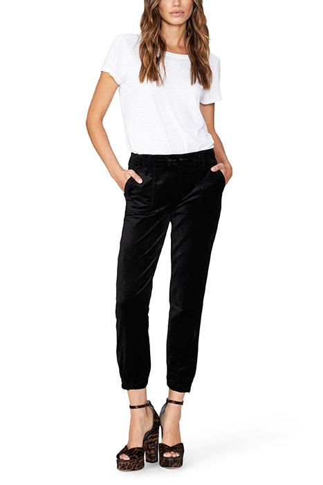 This mid-rise jogger feels feminine and elevated in black velvet. This style was inspired by the utility trend on the runway and PAIGE put a unique twist on it with a streamlined silhouette, double button closure and zipper detail at the ankle. Our ultra-soft, lustrous velvet is fabricated with plenty of stretch for a comfortable and flattering fit. We recommend styling this velvet jogger with a simple tee and sneakers for the farmers market and with a silk blouse and ankle boots for a night out.