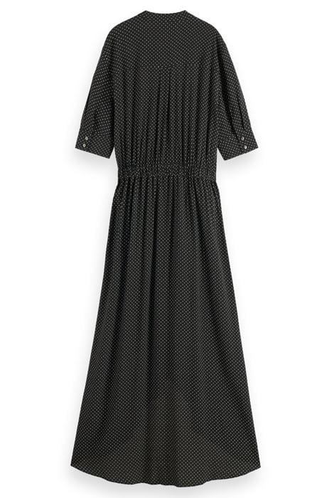 Introducing the stunning Midi Dress with High-Low Hem from Scotch & Soda, available in a sophisticated polka dot print in evening black. This elegant dress is perfect for both formal occasions and casual events, making it a versatile addition to your wardrobe.