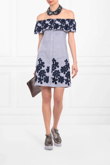 The PALAURA is a yarn dyed striped shirt dress embellished with patchwork embroidered flowers. The ruffled neck is elastic so it can be worn on or off the shoulders. The PALAURA features a classic front button tab and a removable belt that allow you to cinch your silhouette.