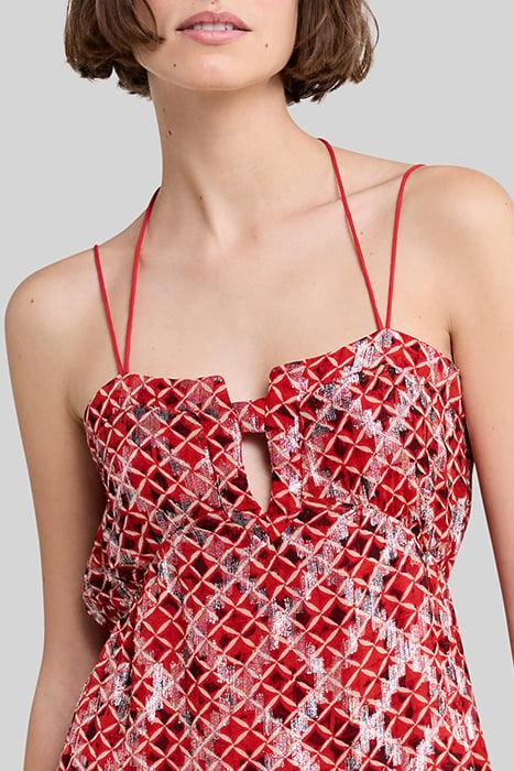 Checks On A Poppy Red Background Lay Claim To A Sophisticated Style On Jacquard Voile With Metallic Threads. The Cord-Style Straps See Double, Subtly Revealing The Shoulders.