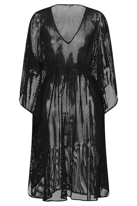 The Victorine Is A Black Net Dress With A V-Neckline. It Has A Tassel Tie At The Waist That Lets You Adjust How Tight Or Loose It Is. The Dress Has 3/4 Length Batwing Sleeves And Falls To The Mid-Calf. It Is Not Lined On The Inside.